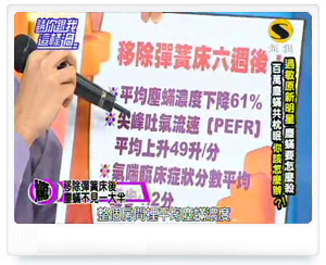 11.黄瑽宁医师在节目中说明使用美国FDA认证的防蹒套者,房间的平均尘蹒浓度下降62.4%,气喘临床症状分数平均进步3.15分,都跟移除弹簧床统计上是一样的